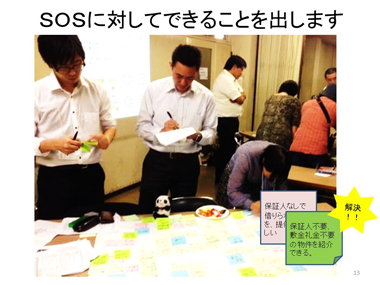 次に、自分のグループを離れて、別のグループに移動します。別のグループに行くと、別のグループのSOS(赤い付箋)に、これできませんか、助けてください、こんな人いませんかというのがいっぱい貼ってあるので、自分ならこれできるというのがあれば、貼っていきます。例えば保証人なしで借りられる住居を提供して欲しいということに対して、それだったら紹介できるという場合は、「保証人不要、礼金敷金不要の物件を紹介できます」のようなことを貼っていく。これによって問題、SOSが解決していくようなことをやっていきます。