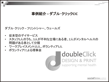 次に、ダブル・クリックの事例を紹介したいと思います。ダブル・クリック・デザイン&プリントですが、メンタルヘルスの問題を持つ人を支援するソーシャルサービスの事業計画として立ち上げられました。こちらのモデルは、モン・ソーシャル・エンタープライズとよく似ています。収入源はグラフィックデザインや印刷サービスを顧客に提供するデザインスタジオという形をとった営利事業からの収入。小企業向けのプリントサービスを提供する隙間市場を狙っています。また、手作りのグリーティングカードも作っています。研修生とボランティアはウェブサイト開発、コンピュータスキルやグラフィックデザインなどの分野に関しての研修を受けますが、より複雑なグラフィックデザインは、健常者に委ねられています。売上高については、既に事業計画の2倍になっており、ダブル・クリックは2016年1月に独立法人となったばかりながら、明るい兆しが見えています。ソーシャルファーム・ウェールズは事業の実現可能性を探り、経営計画の策定を手助けし、元々地方自治体が経営していたので、地方自治体とのリエゾン役を引き受けました。