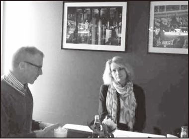 この写真はカフェの中の様子です。壁は暗い赤。壁にはいろいろな額が飾ってあって、コンサートホール付属のカフェのような雰囲気です。右側に女の人がいるんですけれども、このカフェの経営者で、この方はもともと福祉の人ですが経営感覚に優れていたらしく、ここの経営を任されているということだそうです。食事のメニューもアダージョとかバッハとか、いちいち音楽関係の名称がついていて、なかなか感じのいいコーヒーショップでした。