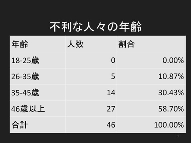 不利な人々の年齢というので、先ほどちょっと出ていましたけれども46歳以上が多い。