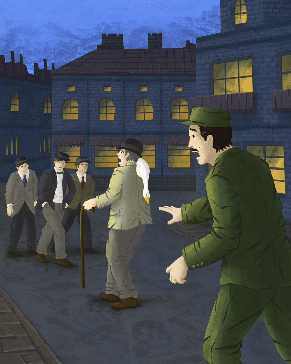 クリスマスの朝、ホテルのドアマン、ピーターソンがホームズのところに、拾ったガチョウと帽子を持ってきます。ピーターソンは、ガチョウを持ち帰ったのですが、そのお腹から青いダイヤモンドが発見されます。これは、伯爵夫人がコスモポリタン・ホテルで盗まれたダイヤモンドに違いありません。でも、どうしてガチョウのお腹に?ホームズは、ガチョウを落とした男、ガチョウを売った店、その店にガチョウを売った男と、ガチョウが来た道を逆にたどっていきます・・・。