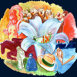 【概要】月夜の晩、文六ちゃんは友だちと祭りに行きます。行く途中で下駄を買いましたが、おばあさんから晩に新しい下駄をおろすと狐がつくと言われてしまいます。文六ちゃん自身も、自分に狐がついたような気がして不安になりました。そして、文六ちゃんは家に帰ると、お母さんに、自分が狐になったらどうするか、ということを聞きます。