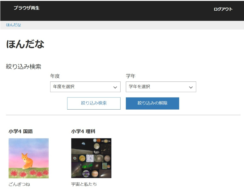ログインすると「ほんだな」で再生できる教科書の一覧が表示されます。年度や学年での絞り込みもできます。再生したい教科書の表紙画像を選択してください。