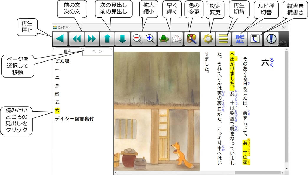 再生したい分冊の表紙画像を選択すると再生画面になります。