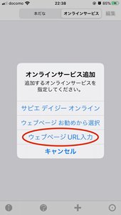 オンラインサービスの追加ウインドウが表示されますので、【ウェブページ URL入力】をタップします。