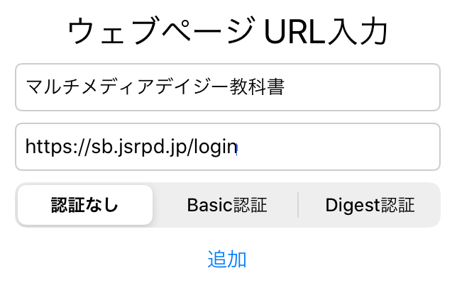 上段にサイト名「マルチメディアデイジー教科書」と下段にURL「https://sb.jsrpd.jp」と入力し、「認証なし」のままで【追加】をタップします。