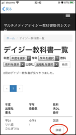 申請されたデイジー教科書の一覧が表示されます。ダウンロードしたい教科書の右端の【詳細】をタップします。