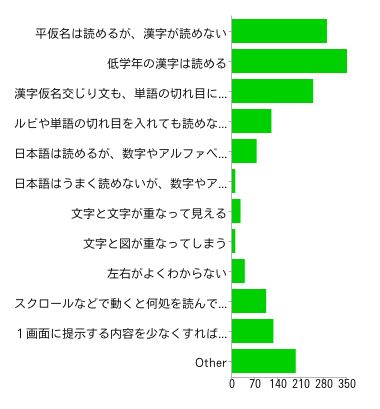 | 日本語は読めるが、数字やアルファベットはうまく読めない | 75 | 9% |