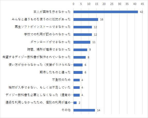 - 学校側が使用を認めてくれず、入学前から導入検討をお願いしているが、デジタルデイジー教科書の扱いを知らない教師が多すぎるようです。知名度が低い。なぜ支援系のデジタル教材の導入を渋るのか?理解ができない。
