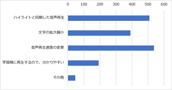 - 対象の児童が、 アーレン症候群の診断が出たことから、 見え方の困難を緩和するメガネを購入したため、 読み上げ機能を使わなくても、 それ程困らない状況になったため。