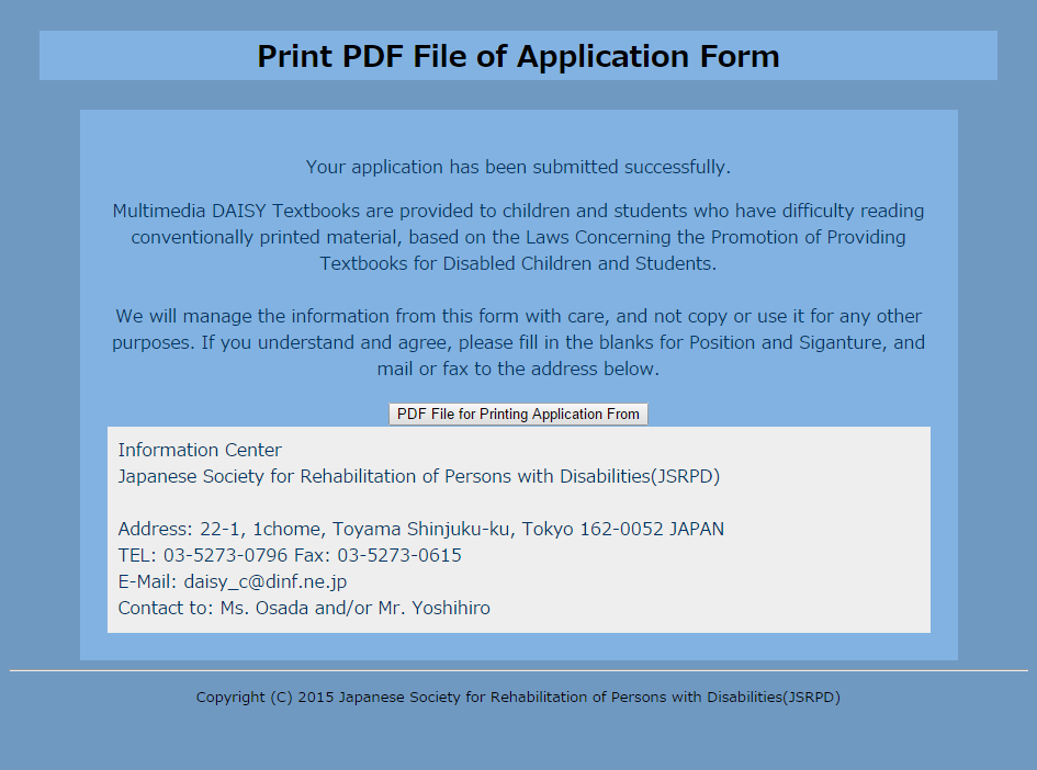- After checking your application form, JSRPD will send you an e-mail explaining how to download multimedia DAISY textbooks. Please acknowledge our mail.