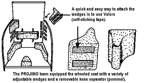 To provide special support for persons who need it, wedges of different sizes and shapes can be made. For the adjustable wheelchair shown here, the team molded wedges made of sawdust mixed with white glue. Wedges can also be made of paper mache or layers of corrugated cardboard (see page 73).