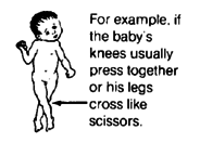 Abnormal reflexesBabies have certain 'early reflexes' or automatic body movements that normally go away in the first weeks or months of life. In children with brain damage, they may last much longer. However, these are only important if they affect how the child moves. 'Knee jerk' and other tendon-jump reflexes are usually over-active (jump higher than normal). If you are not sure, testing for abnormal reflexes may help you tell cerebral palsy from polio. (See Page 40.)