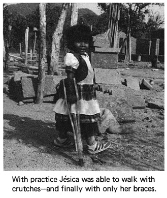 Jésica also lacks normal bowel and bladder control. From the uncontrolled loss of urine, she developed pressure sores in her genital area. Vania, an 8-year-old paraplegic girl, helped treat Jésica's sores. She also assisted Jésica with a 'bowel program', which helps her 'time' her bowel movements (see picture on Page 212). This makes daily activities and going to school much easier.