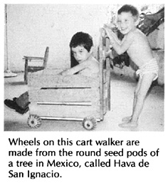 The above walkers can be made with 2 cm. x 4 cm. boards (such as those used on roofs to hold tiles), or thin trees or branches. The wood or plywood wheels roll easily when little weight is on them (when child pushes walker) but have a braking action when child puts full weight on them (when taking a step).