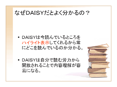 息子の変化ですけれども、ここに挙げた以外にもいろいろあるのですが、ある日息子に「DAISY使ってどう思った?」と聞いたとき「僕、DAISYあったら何でも読めんのになあ。何でもっといろんなDAISYがないの?」と言われました。私は息子が読みたいと言っていた「ハリー・ポッター」が借りたくて、点字図書館へ電話してDAISYが借りられないか聞いてみましたが、そこでは借りることができませんでした。またある日、「DAISYやって、何か感じることあった?」と聞いたとき、「僕は国語大嫌いやったけど、DAISYやったらな、先生の言うことが分かるようになったんやで。僕はみんなみたいにはできへんけど、DAISYやったらできるんやなあって思ったわ」。