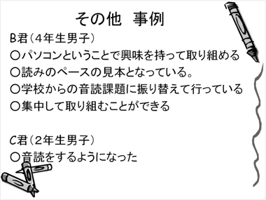 C君についても、音読をするようになりました。この子もなかなか音読ができないお子さんでしたが、自閉的傾向があるお子さんで、その辺でなかなか難しさがあったりしたんですけれども、音読できるようになったという成果としてあったと思います。まだまだ導入段階なので、これからどういう形で音読ができるようになったかということを整理しなければいけないと思っています。