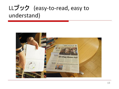次の写真は、皆さんに向かって右側になりますけれども、こちらは、知的障害者向けの8ページの読みやすい新聞です。こういうものを、図書館で閲覧することができるようになっています。これを作っているのが、LLブックセンターというところなのですが、1987年に始まり、初代のLLブックセンター長というのが、LSN分科会での活動を通して知り合った方でした。彼からLLブックについて多くのことを学びました。