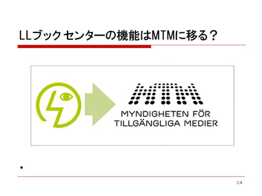 LLセンターは、国立ではないのですが、助成金、運営資金の半分が国から出ており、国の助成があるってうらやましいなと思っていました。そのLLブックセンターが12月で閉鎖されるそうです。「どうしてなのか?」と思うのですが、いままでの運営体制はそのままで、MTMに移るということです。来年からは、MTMという組織の中での一つの分科会として、LLブックセンターの機能が復活することになります。LL出版とか、8ページのLL新聞は、今後もずっと続けていくそうです。MTMにおいても、読みやすくてわかりやすい情報提供もMTMの中心的なサービスと考えているそうで、LLブックを活用して、デイジー化や、動画を作る計画をこれから模索していくようです。このようなことが起こっていたというのは、向こうに行って初めて知りました。ディスレクシア協会の人たちは、「もっとわかりやすい図書を、紙だけでなくて、紙以外のメディアにという思いがあって、国に呼びかけて、こういう結果になったのだと聞かされ、びっくりしております。この動きについて、国外からLLブックがなくなるっていう危機感がありまして、LLブックセンターとか、MTMに問い合わせがすごかったそうで、MTMとLLブックセンターのウェブサイトには、このことについて、質疑応答の形式で状況を掲載しています。ぜひ、見ていただきたいのですが。スウェーデン語です。