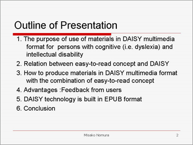 ホーム > 情報アクセス > 読みやすい図書に関するガイドラインと取り組み > 読みやすい図書ワークショップ > DAISY as a tool to create easy-to-read materials