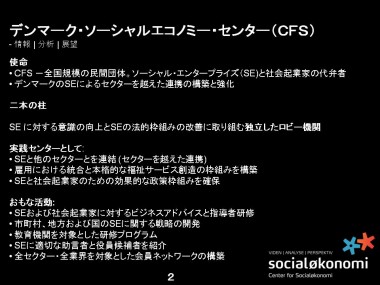 さて、デンマーク・ソーシャルエコノミー・センターですが、私たちはソーシャル・エンタープライズであり、独立した機関であります。私たちは政策的なサポートを行い、アドボカシーを行い、また中間的組織としてソーシャル・エンタープライズを助け、そして政府に対して政策提言を行っている機関であります。