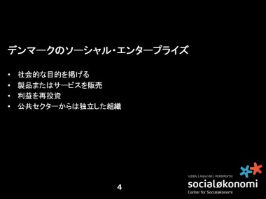 さて、デンマークのソーシャル・エンタープライズとは何か。これは社会的な目的を掲げる組織です。そして製品またはサービスを販売し、それで経費をまかない、利益は使命を果たすべく再投資をします。