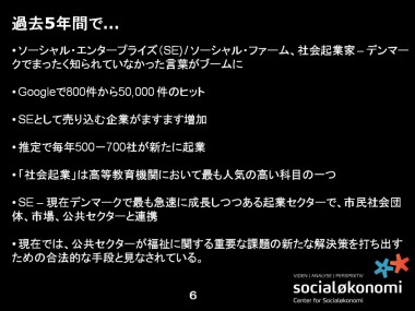 みなさんが北欧の福祉制度にご関心があるということですので、デンマークのような福祉国家で、なぜ今ソーシャル・エンタープライズが盛んなのか。そして最後に、ソーシャル・エンタープライズから私たちが5年間で何を学んだのかということについてお話します。