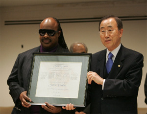 そしてスティービー・ワンダー氏に大使の役割が与えられました。この写真(写真8)に、国連の事務総長がそれを発表している様子が示されております。大いに認められたということです。いろんなところでその歌を聴くことができる、有名な方です。この役割はスティービーさんの障害にではなく、能力に対して与えられたのです。