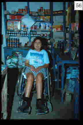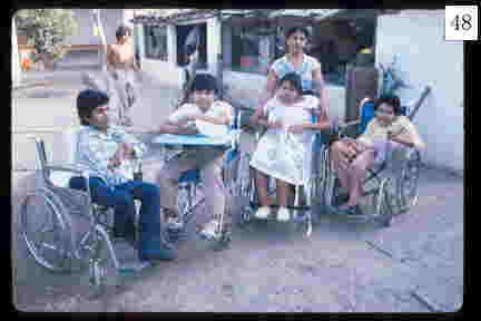 (Slide 60) This is a young man who was a drug trafficker, lived on the streets, the tattoo is sort of a symbol of that sub-culture of drugs and violence. He was shot through the spine. When he arrived at the program, he had severe pressure sores with dead black flesh in them down to the bone. In the Third World, most spinal cord injured persons don't live more than one or two years and they die mostly from pressure sores. In a poor country or community, you cannot get involved with disability without becoming involved with human rights. |