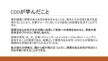 これらの人々の特別ニーズに取り組みながら、CDDはジェンダー特有の点と 障害のある女性と少女がさらなる困難に直面していることを学んだ。