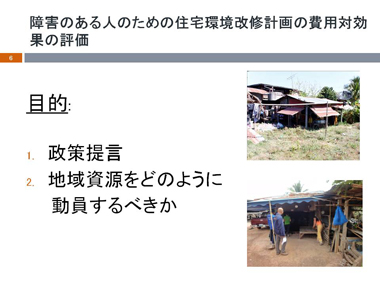 タイでは、2007年の障害者エンパワメント法によって、障害のある人は登録されていれば住宅環境サービスが受けられるようになった。県の社会開発・人間安全保障局は障害のある人の住宅改修サービスの責任を担う。しかしながらこのサービスへのアクセスは多くの問題により制限されている。例えば、住宅改修に関する知識や計画的なサービス提供が不足していることやアクセス方法、家族の経済面の問題である。地域資源動員はWHOのCommunity Based Rehabilitation(以下CBR)マトリックスのエンパワメント項目の内の1つである。これらの住宅改修の支払い困難な人々にとって、サービス補助を受けるために地域資源が利用可能である。