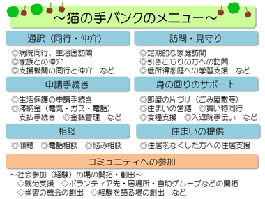 ①まず、「パーソナルアシスタント」です。私たち猫の手ボランティアは、同行・自宅訪問などのアウトリーチにより本人の生活する場所まで出向き、本人が一番解決したいこと・かなえたいことに個別でよりそいます。