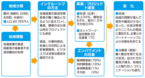 ●関係当事者:県内の福祉関係機関、自立支援協議会、就労関係ネットワーク、医療機関および行政、農家を含む取引事業所、直売店・カフェこころやの客、里山再生プロジェクトに関わる人たち、大木大吉本店(酒造)、白河園芸総合センター、地域住民。