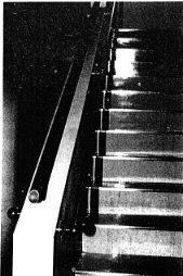 ▼町役場玄関前のスロープ(下)と▲役場庁舎内階段の手すり(上)。いずれも建設後に整備したものです。
