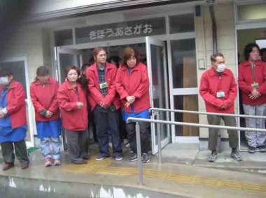 朝、警戒区域への南相馬市側入り口、津波被災地を視た後、NPO法人あさがお(南相馬市鹿島区)を訪問した。B型就労継続支援施設やグループホームの運営を行っており、理事長以下50名位の施設利用者に集まって頂き懇談した。精神障害の利用者が多いが、「被災時には一般の避難者も受け入れた。3月11日の震災の後、グループホーム利用者や一人暮らしのひと18名と一緒に、3月17日に山形県上山市に着き、3月31日まで避難生活を送った」とのこと。上山市の避難所では2部屋しか借りることが出来ず、「精神障害だから皆と同じ表からは出入りしないでなど差別的なことがあった」と説明された。