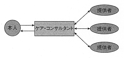 〈モデルB〉 利用者の指示に従って、ケア・コンサルタントが専門職種や必要な情報を集めてケア計画を提案したり、ケア・コンサルタントの紹介や情報にもとづいて、利用者本人がケアをマネジメントする。 〈モデルB’〉 マネジメントするケアの分野は、利用者本人が自分でマネジメントをすることが苦手な分野に限られる。 時間的経過: |