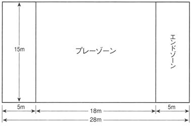 - コートは室内でバスケットボールコート(28m×15m)を使用し、プレーゾーン(18m×15m)、両端にエンドゾーン(5m×15m)2か所。