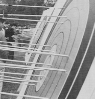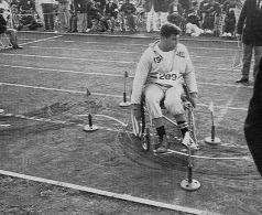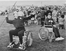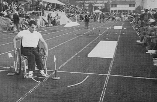 たとえば、槍や砲丸、円盤投げなどの投てき競技で、選手たちの車イスの後にうずくまって、車輸をしっかりと押えていたボーイスカウト諸君の姿である。これは全くカゲの力であるが、体格のよい外国選手の反動を止めるのは、たいへんな力がいる。いうまでもなく、普通、投てきに必要な力は、下半身のふんばり(きき足)いかんできまる。これが車イス選手の場合では、その車イスが下半身にあたり、きき足にあたる。そこで車イスがしっかりと止っていなければ、妙技をふるうことができない。したがって、車イスを固定する装置を使う場合があるのだが、東京大会ではその装置が無かったために、介添え役が車イスを固定することになったのだ。