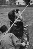 槍投げは、からだのバランスと腕の力を訓練するもので、槍は長さ2.20m、重さ600gの女子用槍をつかう。障害の程度によって4階級に分けて行なわれる。車イスの上から尾をひいて投げられる槍さきは、みる人の心をつきさすようなすごみがある。
