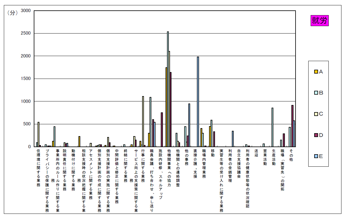 調査期間中の業務内容をもって「就労分野」における専門的な業態と見なすわけにはいかないというのが事実で、先のヒアリングでも明らかなように、「サービス管理責任者」の立ち位置が定まらないという実態を反映している。また、就労分野においては、ある程度の権限を必要とするということもあり、結果的に施設長などの責任者が兼務することになり、サービス管理責任者の独立性が維持されていないという状況がある。また、労働分野の酷似した職種もあり、その専門性の確立は喫緊の課題でもある。