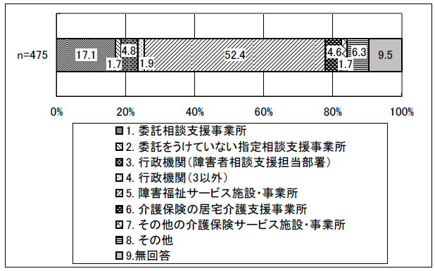 ○勤務している事業所の種別は、「障害福祉サービス施設・事業所」が52.4%で最も多く、「委託相談支援事業所」が17.1%と続いていた。