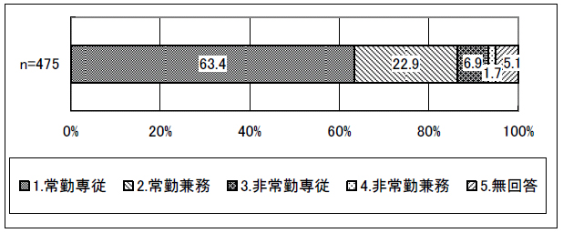 ○勤務形態は、「常勤専従」が63.4%で最も多く、「常勤兼務」が22.9パーセントと続いていた。