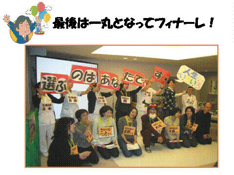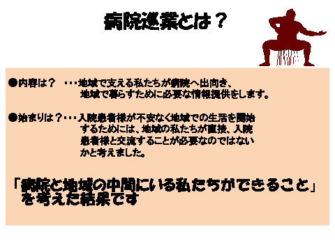 内容: 病院職員の方と協力して、入院患者さんを対象に、退院した患者さんや作業所利用者の体験談を中心とした、退院後の生活をイメージできる院内説明会を行う。