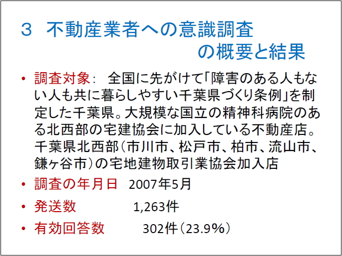 •調査対象:全国に先がけて「障害のある人もない人も共に暮らしやすい千葉県づくり条例」を制定した千葉県。大規模な国立の精神科病院のある北西部の宅建協会に加入している不動産店。千葉県北西部(市川市、松戸市、柏市、流山市、鎌ヶ谷市)の宅地建物取引業協会加入店