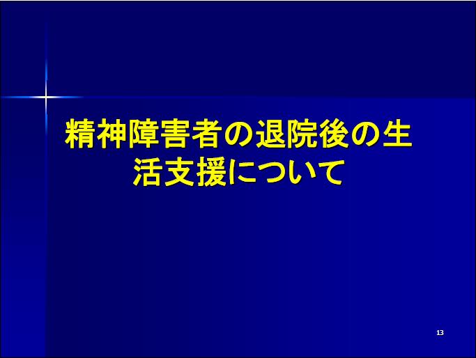 ホーム > 調査・研究 > 厚生労働科学研究 > 平成21年度厚生労働科学研究費補助金 障害保健福祉総合研究成果発表会報告書 > シンポジウムI スライド10~19 地域生活の支援 > シンポジウムI 地域生活の支援 スライド13