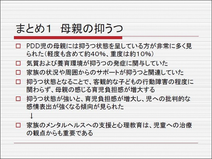 - PDD児の母親には抑うつ状態を呈している方が非常に多く見られた(軽度も含めて約40%、重度は約10%)